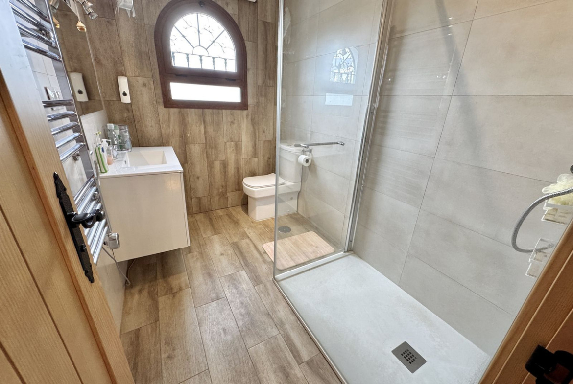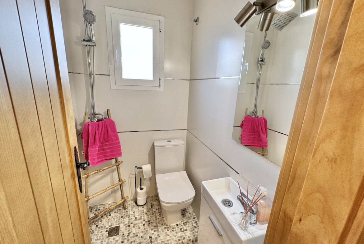 Pääkerroksessa on avara olohuone. Olohuoneessa on takka ja kaksi lasiovea, jotka johtavat tilavalle terassille sekä puutarhaan, josta on avoimet näkymät. Keittiö on täysin varusteltu ja moderni. Sisäänkäynnin vieressä on vaatehuone sekä wc/kylpyhuone suihkulla. Toisessa kerroksessa on kaksi tilavaa makuuhuonetta, joista toisessa oma pieni parveke ja kylpyhuone.